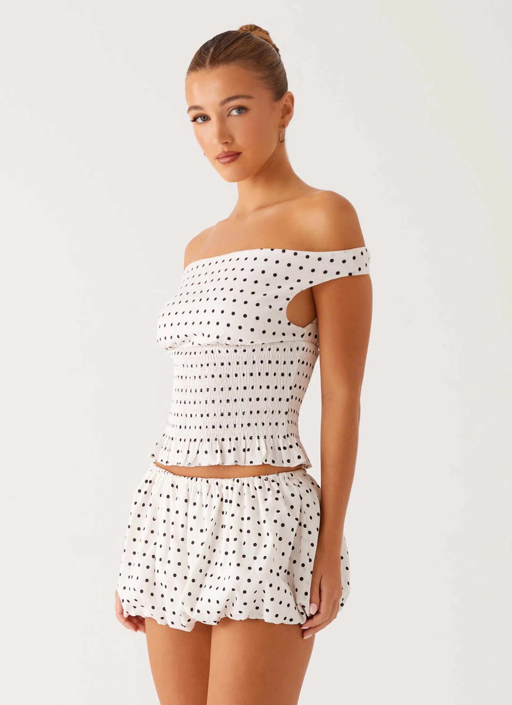 Playful, bold, and full of movement — the Heather Mini Skort in White Black Polka Dot is your perfect mix of fun and edge. With a low-rise fit, attached shorts, and a flirty bubble hem, it’s made for those nights where anything can happen.